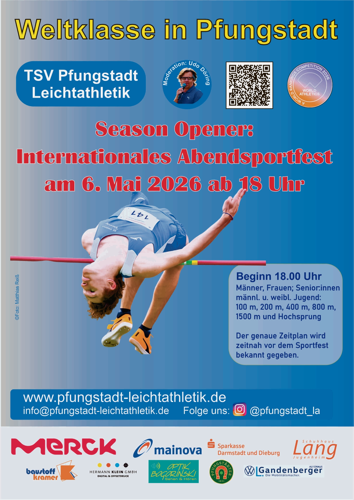 Die Anmeldung zum 1. Abendsportfest am 6.5.2026 ist eröffnet: https://ladv.de/ausschreibung/detail/47098/Pfungstädter-Abendsportfest-Pfungstadt.htm